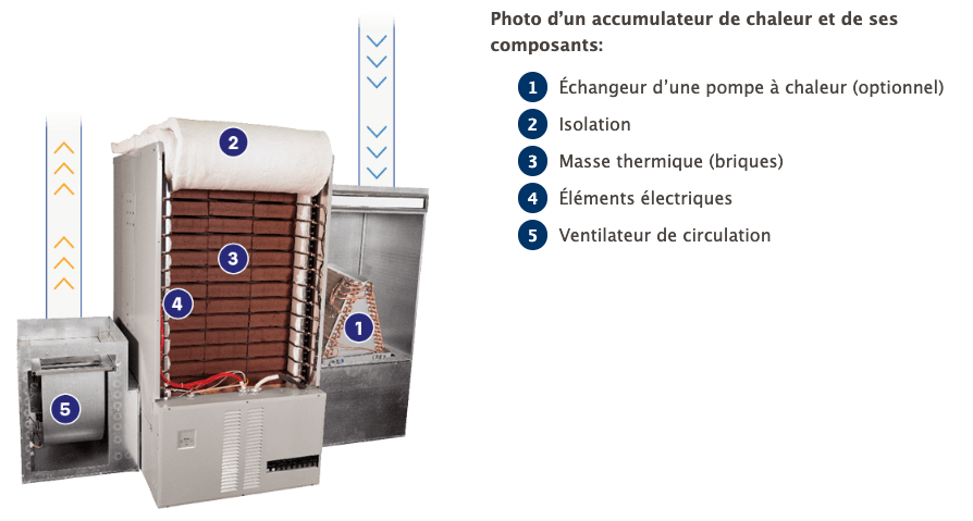Un accumulateur thermique est un système de chauffage central qui emmagasine l’énergie, sous forme de chaleur, lorsqu’elle est disponible pour ensuite en permettre l’utilisation en période de pointe, alors que les éléments électriques cessent de fonctionner. Il existe plusieurs systèmes de stockage thermique à la fois pour les systèmes à air pulsé, hydroniques ou décentralisés. Généralement, on les retrouve sous deux formes : le stockage de masse (image) et le stockage par changement de phase.